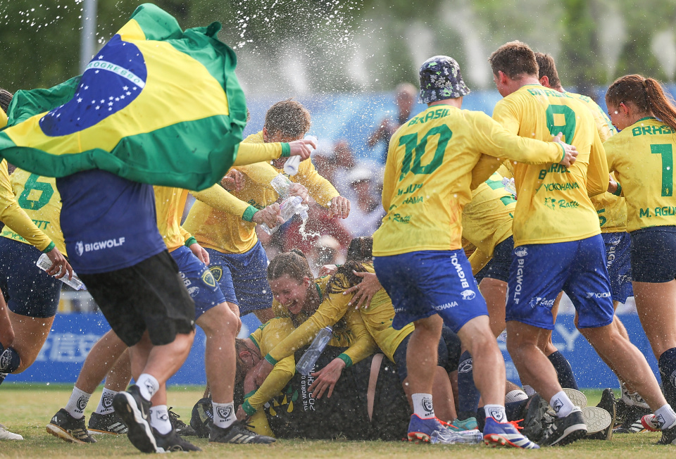 8月13日,巴西队球员在夺冠后庆祝。新华社记者 陈诚 摄