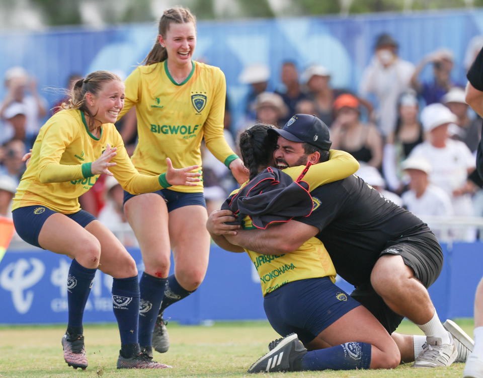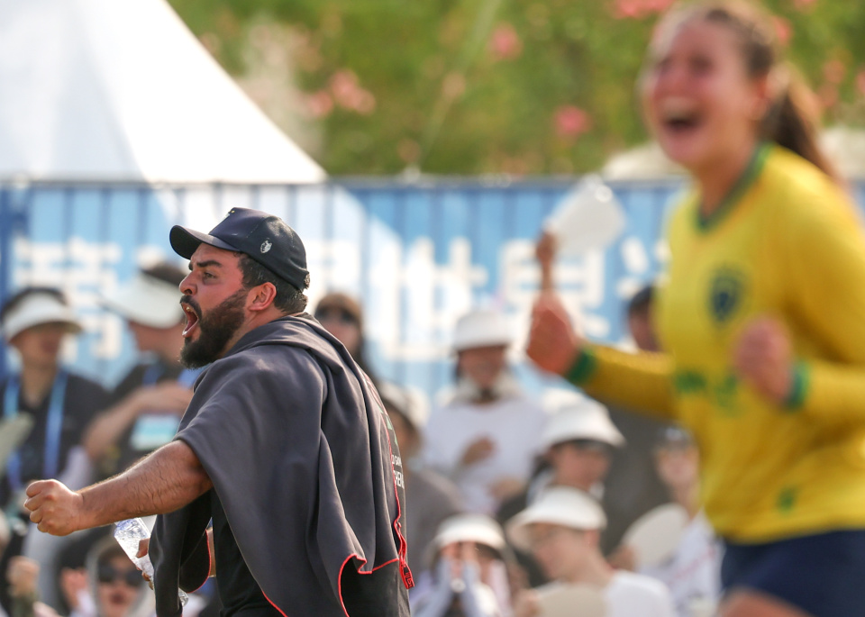 8月13日,巴西队教练员韦内罗索(左)在比赛中庆祝。新华社记者 陈诚 摄